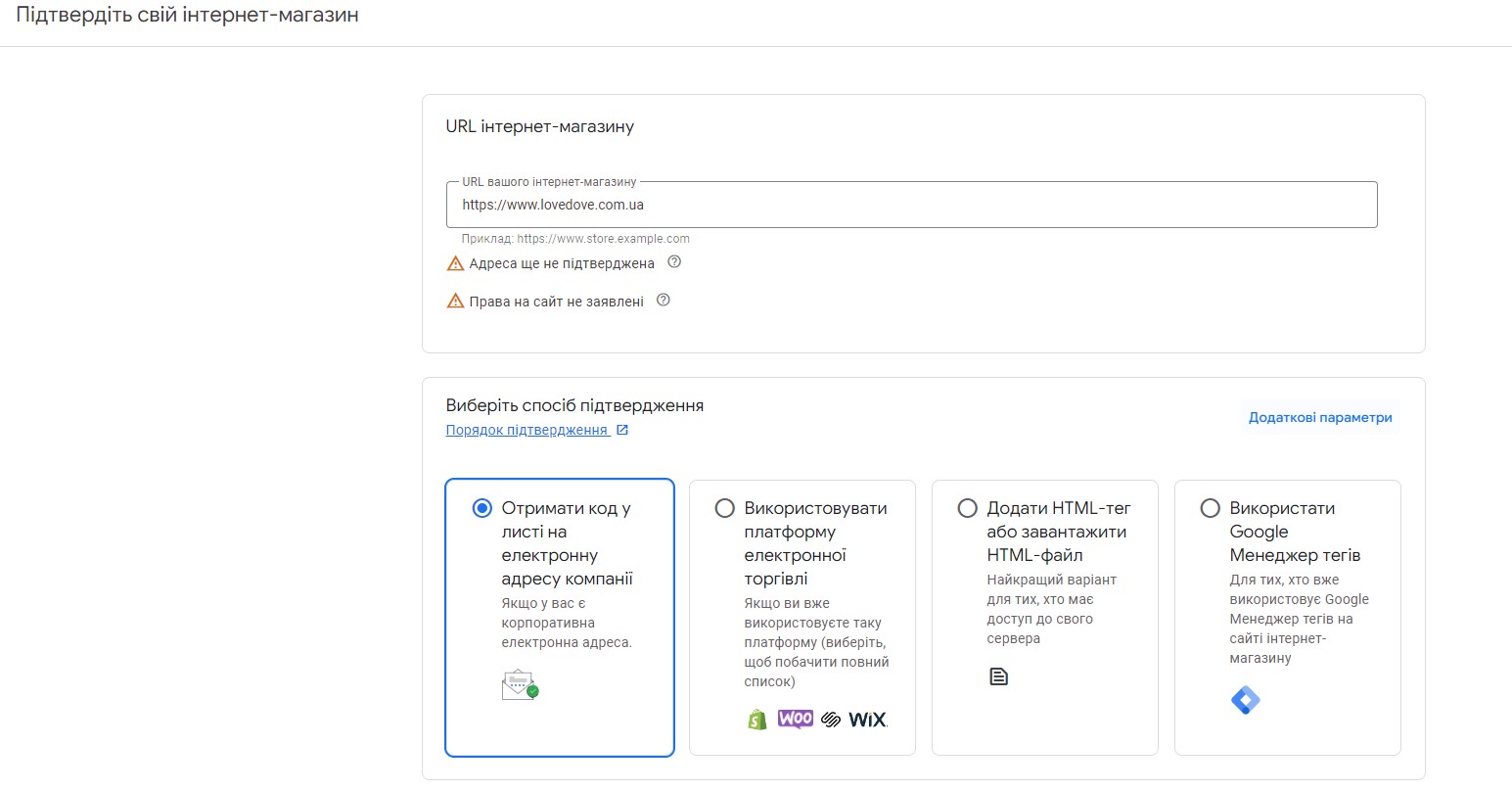 Завершальний етап налаштування в Merchant Center — зазначення адреси сайту та верифікація. Для цього можна скористатися одним із запропонованих способів: