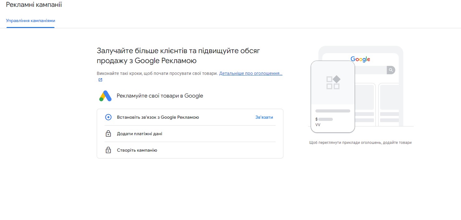 Щоб керувати рекламними оголошеннями, необхідно пов’язати акаунт з Merchant Center. Якщо ви використовуєте одну й ту саму електронну адресу, то синхронізація відбудеться автоматично. Якщо ні, то зв’язати акаунти потрібно буде вручну.