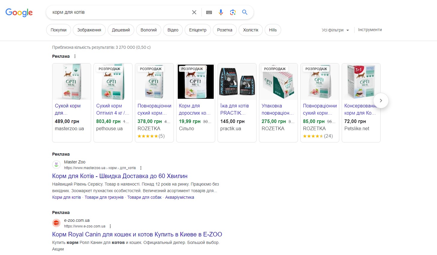 Контекстна реклама працює на основі моделі оплати за клік (Pay Per Click). Тобто, вона передбачає оплату в той момент, коли потенційний клієнт переходить за вашим оголошенням на сайт для здійснення покупки. Такі рекламні оголошення зазвичай користувач бачить у рядку пошукових систем. Наприклад, якщо ви шукаєте корм для котів, то в Google побачите ось таку рекламу: